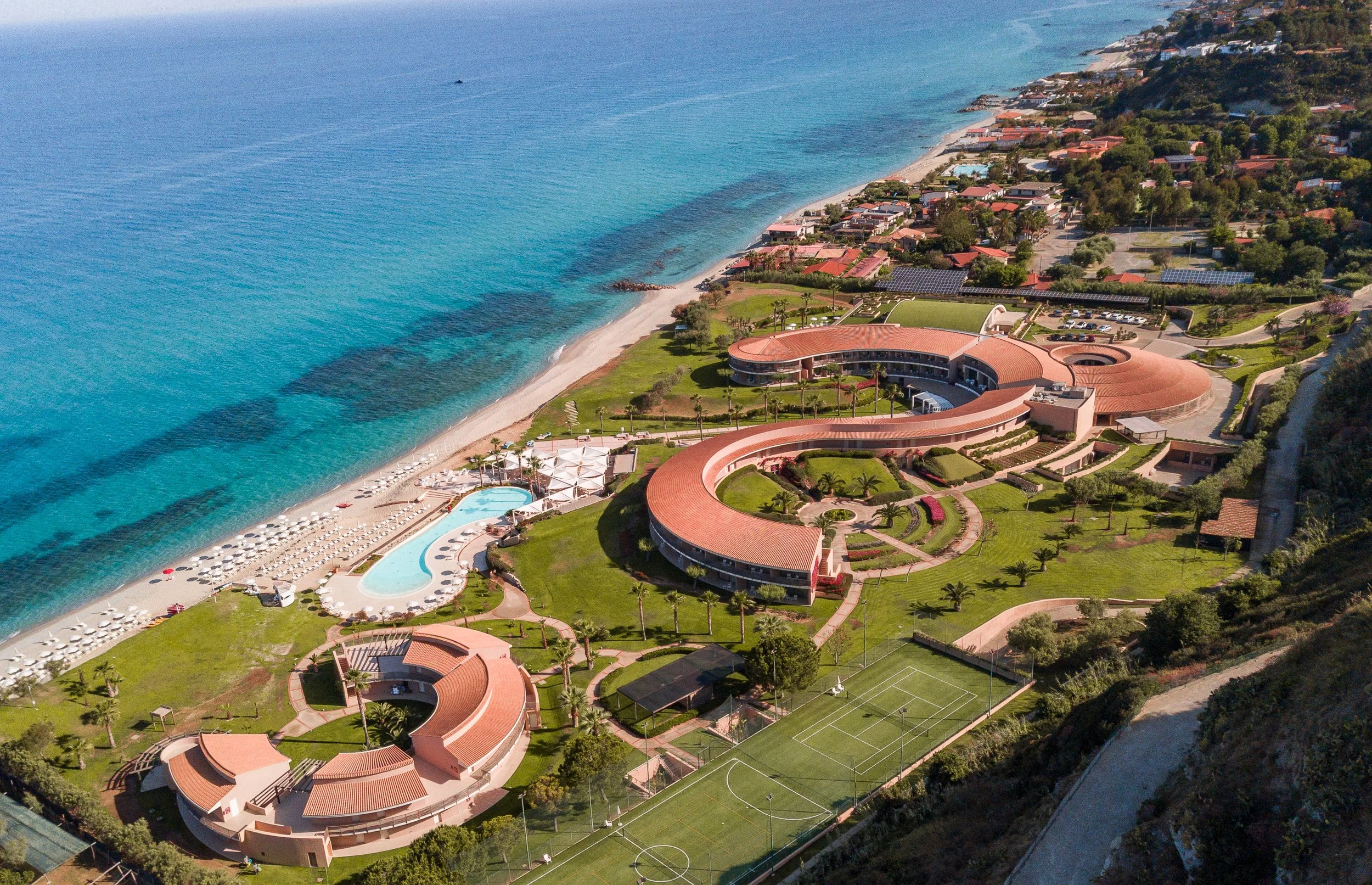 La fotografia aerea, con il suo punto di vista unico, riesce perfettamente a trarre il massimo dal contesto in cui si trova la struttura e a valorizzare la stessa.